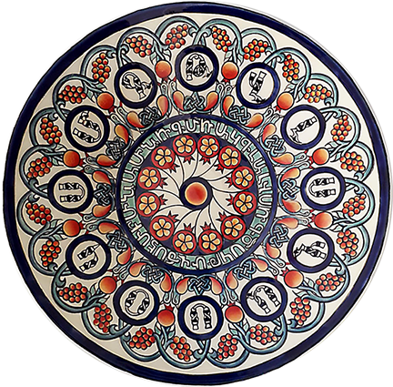 הקערה מעוטרת מבפנים ומבחוץ בשריגי גפן שבתוכם, במקום הציפורים מהפסיפס העתיק, משולבות אותיות ארמניות. האותיות הגדולות הן האות הראשונה בשמות הסבים והסבתות והקטנות מייצגות את שמות הילדים והנכדים.