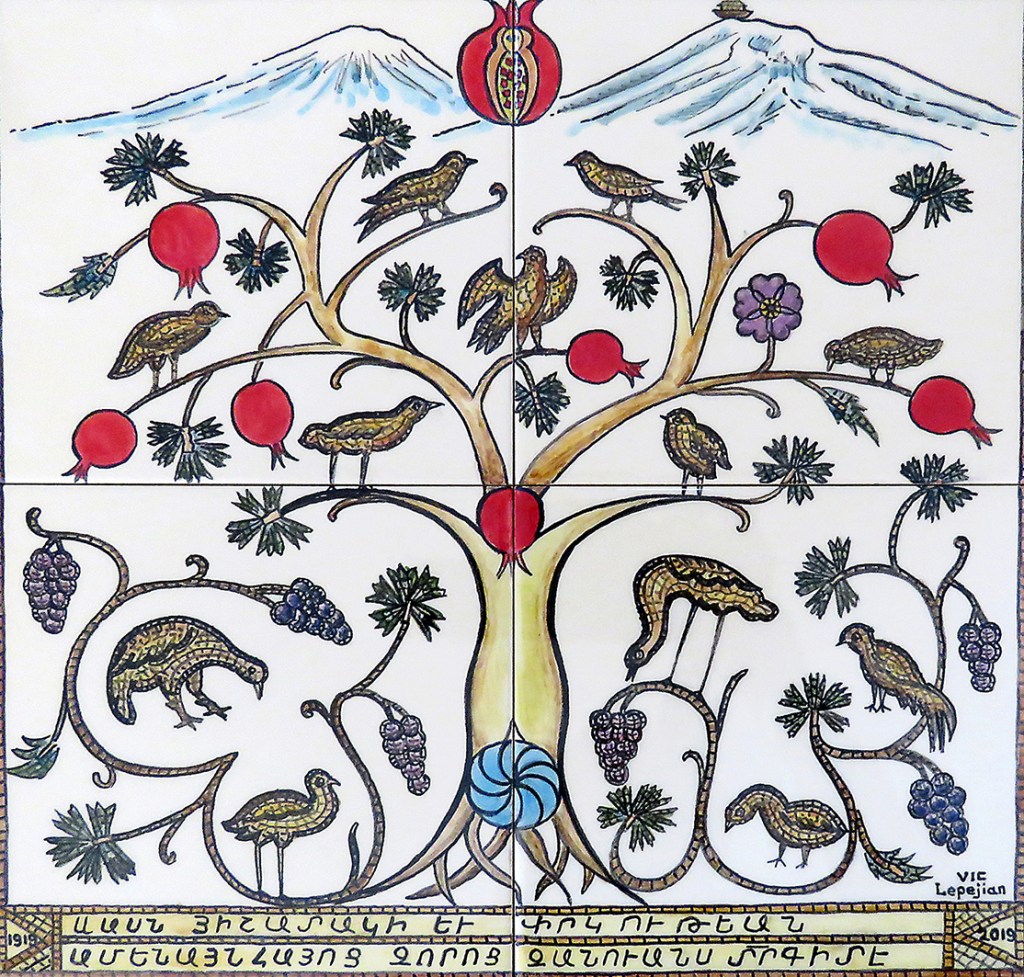 في قاعدة الشجرة دائرة ترمز إلى الخلود، جذعها يرمز إلى المصلوب (المسيح)، وكلّها تمثل معاناة الشعب الأرمنيّ ونهضته. العصافير الخمسة الاسفل ترمز إلى القارات الخمس التي تهجّر اليها الأرمن أمّا العصافير السبعة في الاعلى فترمز إلى أيّام الخليقة السبعة. فوق الجميع يرتفع جبل أرارات من الوطن الأرمنيّ والكتابة تخليدا "لذكرى الأرمن"، وهي من فسيفساء العصافير القديمة.