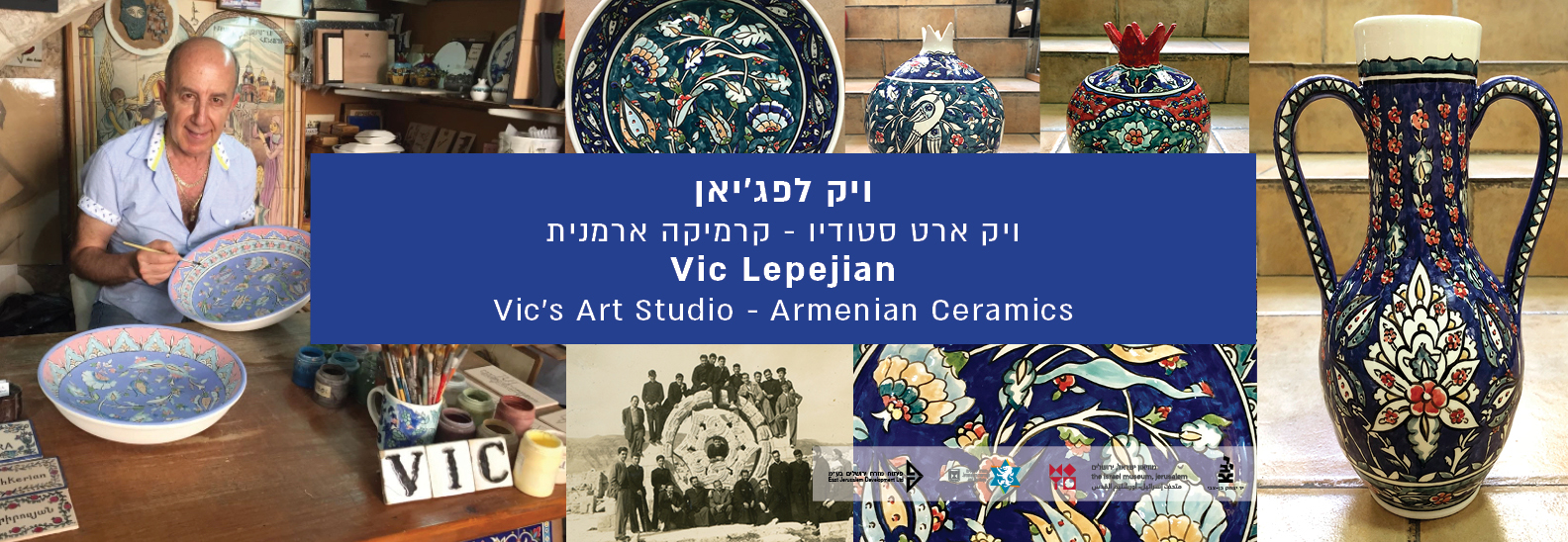 Vic’s Art Studio was opened in 1975 by Vic Lepejian, a member of the Jerusalem Armenian community. In the 1960's, Vic's father, a local educator and an Armenian patriot, sent his son to complete his studies at the Academy of Fine Arts in Yerevan. Upon his return to Jerusalem, Vic began painting and decorating ceramics, developing a unique and varied style, ranging from realistic paintings, to black and white patterns and traditional designs. The Armenian Genocide continues to be a central focus of Vic's work as well as the daily life of members of the various communities and religions in Jerusalem.