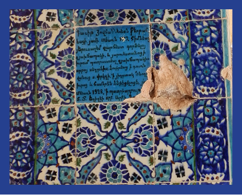 David Ohannessian of Kutahya, in the year of the Lord 1919, established the art of ceramics in Jerusalem, and in his workshop he prepared the tiles of this holy altar, dedicated at the gate of St. Saviour Monastery in memory of his parents and all the deceased, in the year of the Lord 1928, during the patriarchate of Archbishop Yeghishe Turian.